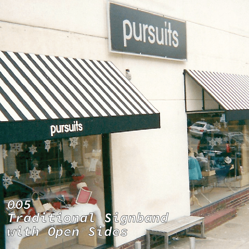 The Traditional Signband with Open Sides awning canopy offers a classic look that enhances storefronts while allowing airflow with its open side design. Crafted from durable, weather-resistant fabric, this canopy provides excellent protection from sun and rain, making it ideal for businesses seeking both style and functionality.
